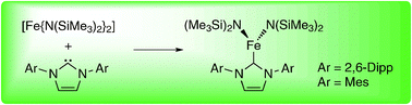 The three-coordinate NHC iron(II) complexes [(NHC)Fe{N(SiMe3)2}2] (NHC = IProrIMes) are stable in the solid-state but dissociate their NHC ligands in solution due to steric overcrowding.