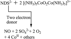 Cobalt(III)-bound superoxide (1) forms a spin adduct with nitrosodisulfonate anion radical (NDS2-) and oxidizes it by two electrons. Towards 1, NDS2- is a kinetically controlled product and its further oxidation lowers the yield.
