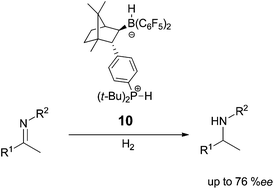 A camphor based chiral phosphonium hydrido borate zwitterion was synthesised and successfully applied in the enantioselective hydrogenation of imines with selectivities up to 76% ee. The high stability of the novel chiral FLP-system enables effective recycling of the metal-free catalyst.