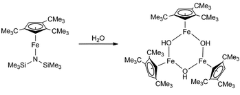 Addition of stoichiometric quantities of H2O to the pogo-stick complex [Cp[prime or minute]FeN(SiMe3)2] yielded the trimeric [{Cp[prime or minute]Fe([small mu ]-OH)}3] complex in which the high-spin iron(II) centres exhibit antiferromagnetic exchange coupling.